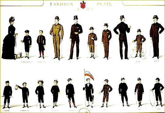 British fashion plate, mostly men and boys, 1885. Scan of 2 d images in the public domain believed to be free to use without restriction in the US.